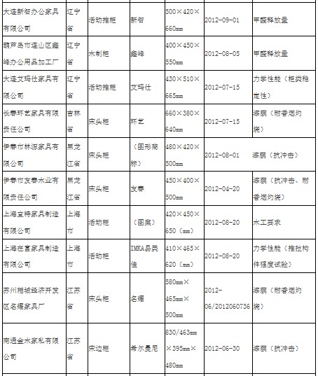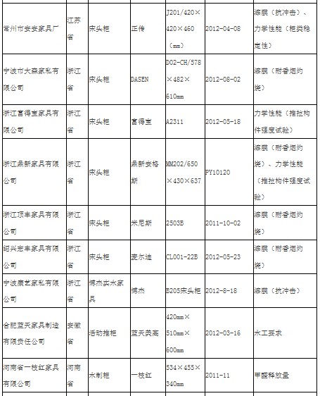 国家质检总局网站公布的结果显示,抽查了北京、天津、河北、山西、辽宁、吉林、黑龙江、上海、江苏、浙江、安徽、福建、江西、山东、河南、湖北、湖南、广东、广西、重庆、四川、贵州、云南、陕西等24个省、自治区、直辖市239家企业生产的239种木材(制)家具产品。.2%。不合格项目涉及甲醛释放量、木工要求、柜体稳定性、推拉构件强度、香烟燃烧、耐磨、抗冲击、附着力等。