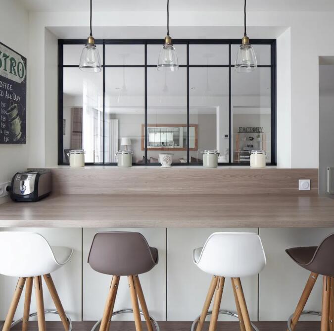 小家庭厨房空间通常相对紧张,加上一些厨房门小,导致空间非常封闭。在墙上打开一扇室内窗户,可以有效地缓解空间的狭窄感,甚至让窗台变成一个小酒吧,人们可以直接在这里吃饭,非常方便!