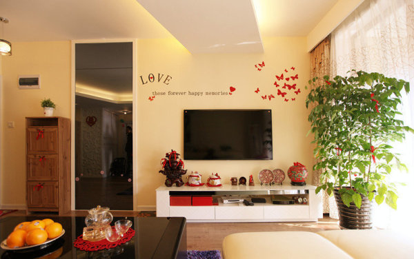 2.客厅四面墙的颜色是黄色墙漆、鲜橙色墙漆、橙色小格子墙纸、黄色小架子,有暖色渐变、时尚,呼应这种变化,客厅墙上的挂画颜色是黄色、黄绿色、绿色的变化。浅咖啡色的沙发相对低调,因为沙发旁边的餐厅颜色太引人注目,所以故意选择普通的沙发,简单的茶几风格。电视墙只使用简单的黑色和白色两种颜色的简单墙贴纸,非常生动。客厅使用了几个墙贴纸,门对面的墙是绿色的花图案墙贴纸,分散,客厅和门厅之间是白色的隔断窗帘。