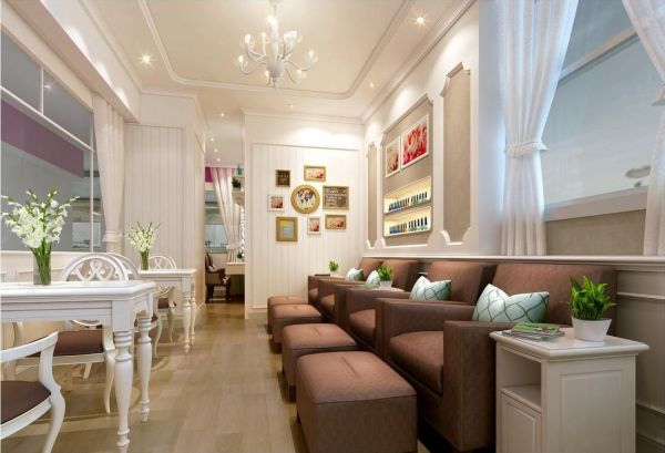 指甲店的接待区应根据店铺的大小设置,接待区主要配有沙发和桌子。一般来说,沙发的风格应与整体风格相匹配。接待区在不同的地方给人不同的感觉。比如接待区放在门上,照明好,让消费者视野开阔,感受室内外环境。接待区也位于角落。虽然不显眼,但可以为消费者提供休息场所。如果商店没有足够的空间,你可以暂时放置一个不占用空间的工作台,你可以随时更改位置。